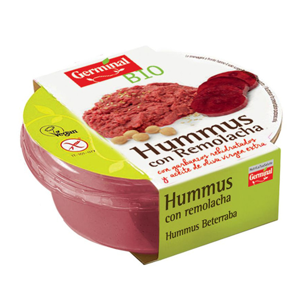 Hummus de remolacha sin gluten de Germinal Bio. ¡Tiene un color morado brillante y una textura suave y delicada! El hummus de remolacha es sin gluten, apto para celíacos. Elaborado con aceite de oliva virgen extra. 100% vegetariano y vegano.