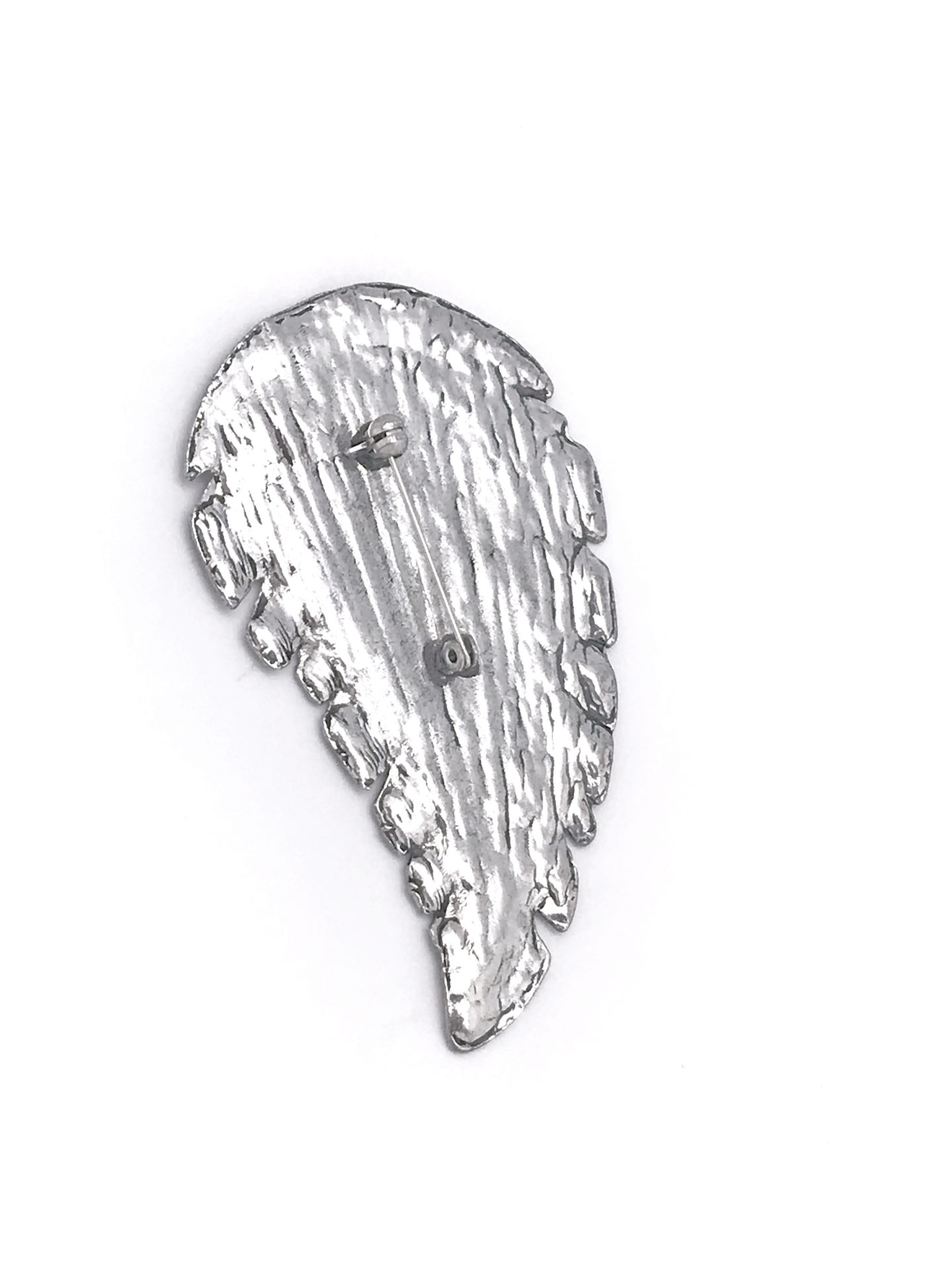 Broche de zamak chapado en plata de ley con forma de pluma en tamaño 9x5cm Cierre de seguridad, Diseño exclusivo Gloria Mago,