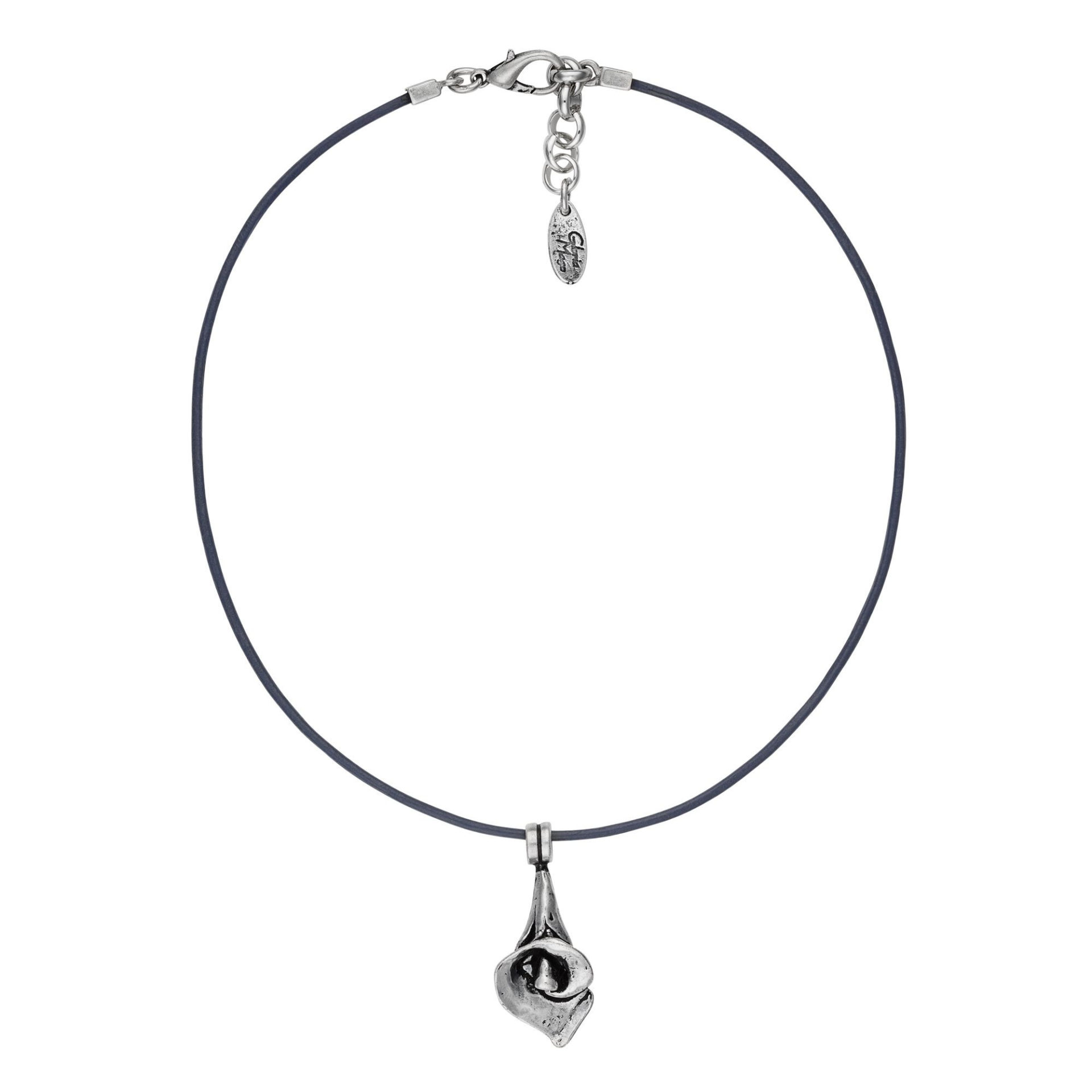 Gargantilla de cuero en azul con colgante de cala en plata zamak chapado plata de ley, tamaño 40 cm + extensión, Cierre de mosquetón, Fabricado en España